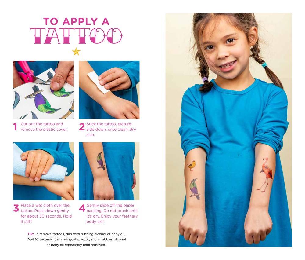 From the common Barn Swallow and American Goldfinch to the dangerous Australian Cassowary, birds' distinct personalities and colorings make them a favorite fascination of kids of all ages. A bevy of bird species soar across each page of Soaring, Singing Tattoo Birds, which animal-loving kids will love to wear right on their skin! 50 vibrantly colored, illustrative temporary tattoos are scientifically accurate and easy to apply with just a little water. Plus, each bird species is accompanied by fun and fascinating facts. Did you know that the Scarlet Ibis’s brilliant color comes from the large amount of shrimp and red shellfish in their diet? Or that the yellow feathers on the Macaroni Penguin’s head gave them their name, since “macaroni” is a historical slang term for male fashion? Kids will love quizzing their friends on newly learned avian trivia while showing off their interesting ink.