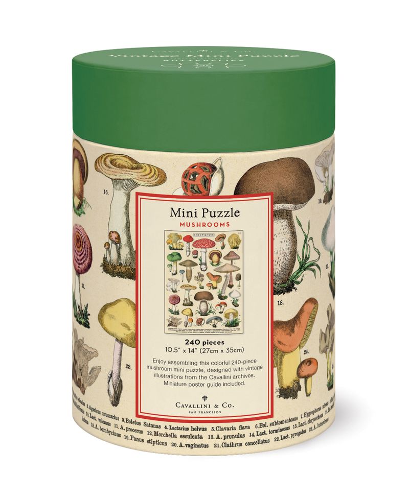Enjoy assembling this colorful 240-piece mushroom mini puzzle, designed with vintage illustrations from the Cavallini archives.
