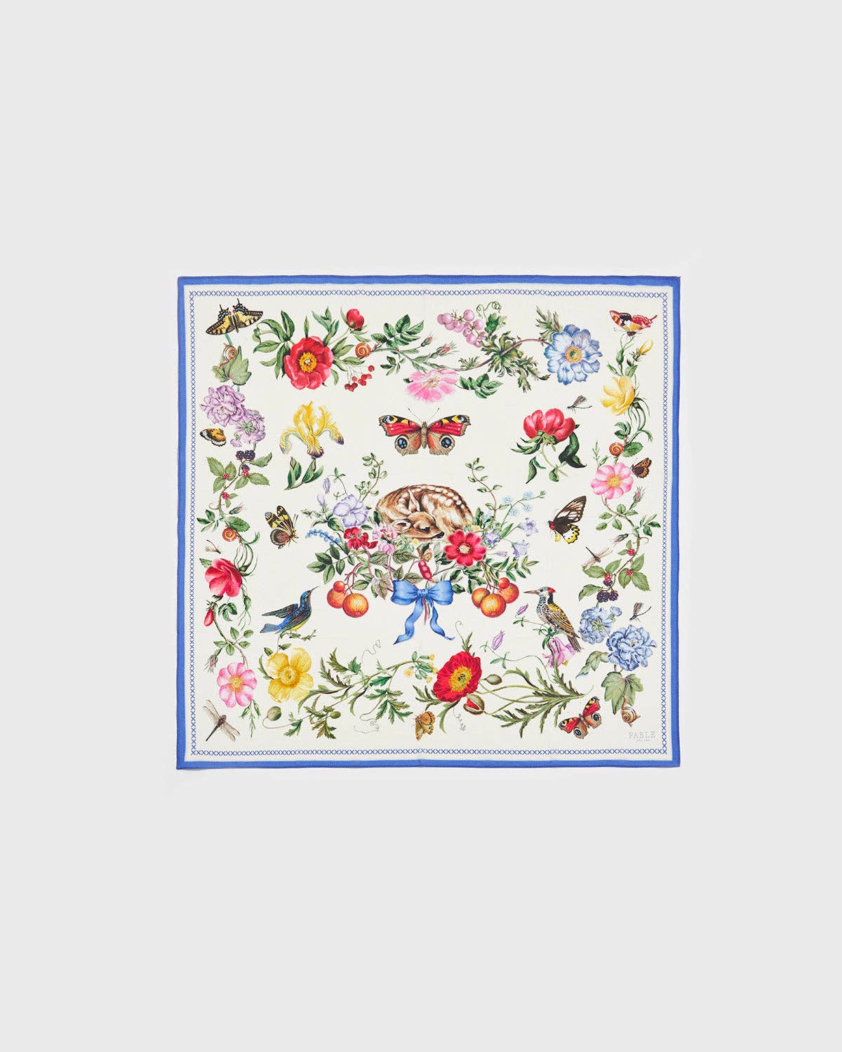 Featuring a beautifully hand-drawn print inspired by nature and nostalgic storytelling, the design includes vibrant florals, delicate birds, butterflies, and Fable's signature muse – the gentle doe, Agnes, nestled at the centre. Crafted from a premium silk blend, this scarf offers a lightweight, luxuriously soft feel, perfect for versatile styling.