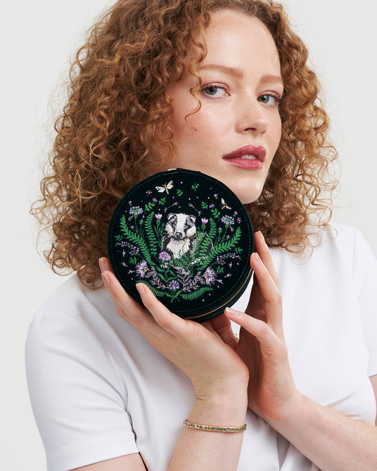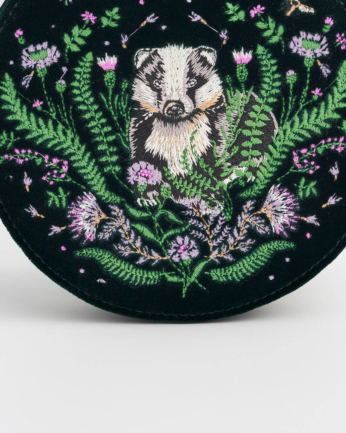 Inspired by the wisdom and mystery of woodland creatures, the Badger Embroidered Jewellery Box offers a charming and practical solution for storing precious keepsakes. Perfect for retailers seeking elegant, nature-themed accessories that combine storytelling with everyday functionality. This compact round jewellery box features a rich forest-green velvet-style polyester exterior embroidered with a detailed badger motif, bringing a touch of woodland magic to any dresser or travel bag. Inside, a soft polyester lining and eight ring slots provide gentle protection and organisation for delicate jewellery.
